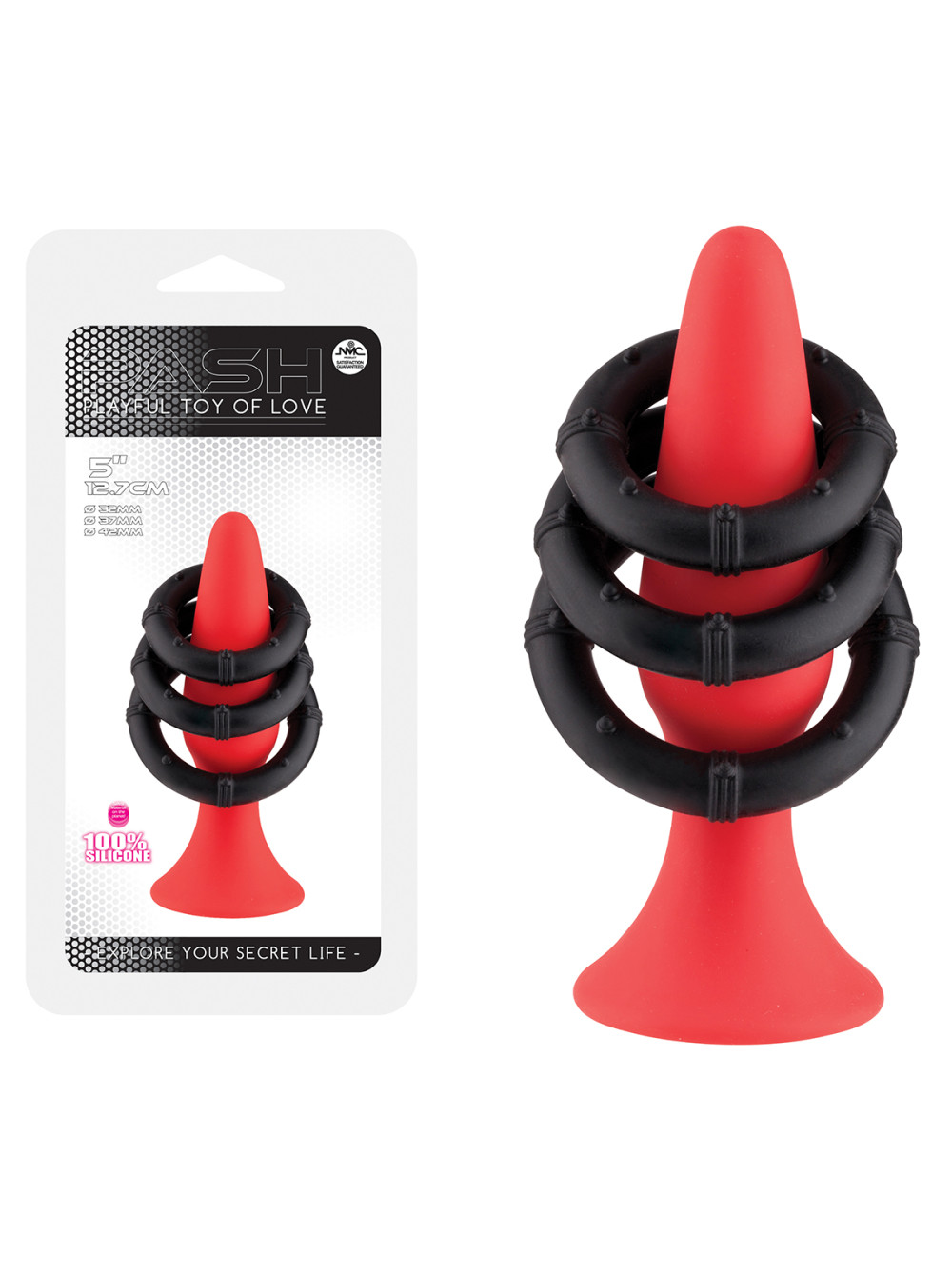 Красный плаг для анальной стимуляции из силикона. Высота от ограничительного основания 10 см, диаметр от 1 см до 3 см. В наборе 3 черных силиконовых кольца, которые можно использовать на пенисе и мошонке. Диаметр колец 3, 3,5 и 4 см.