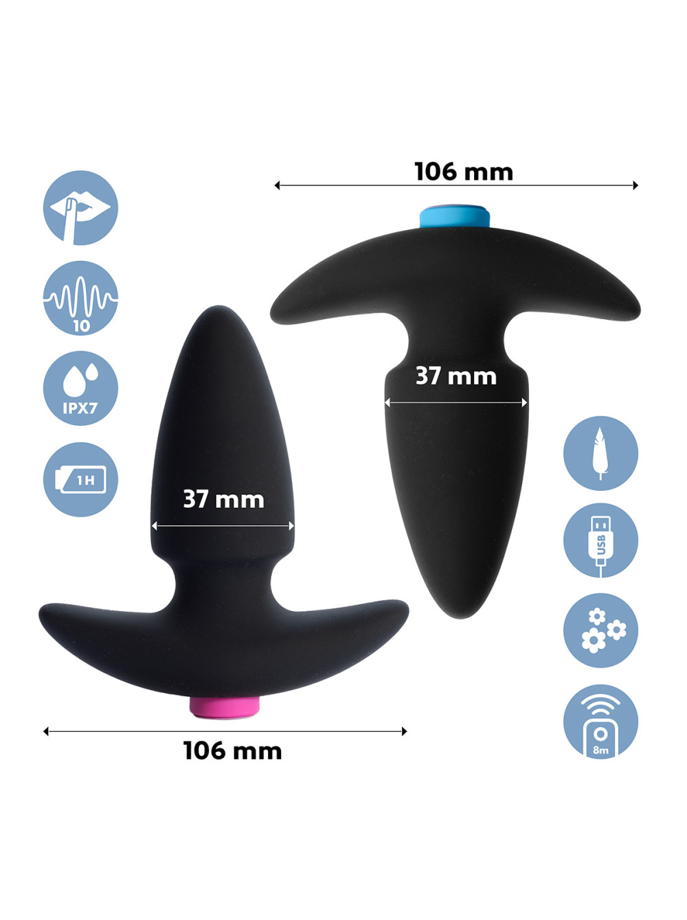 Набор из 2-х вибрирующих анальных пробок с дистанционным управлением для пар, который могут носить оба партнера одновременно во время полового акта. Пультом дистанционного управления можно регулировать оба плага одновременно, либо можно управлять по отдельности. Придайте своей сексуальной жизни дополнительный импульс и отправляйтесь в путешествие вместе! У плагов 10 моделей вибрации, у вас есть большой выбор, чтобы найти интенсивность и паттерн, которые вам понравятся. Экспериментируйте, где хотите, потому что пробки полностью водонепроницаемы, поэтому с FunkyButts можно заниматься любовью даже в душе или в ванне. А развлекаться можно долго, ведь пробки работают до полного часа работы от полного заряда батареи, 8 часов в режиме ожидания. Или вы хотите сделать еще один шаг вперед? Развлекайтесь с анальными пробками вместе со своим партнером если у вас романтический вечер или ночь вместе. Дразните друг друга и выберите, кто будет держать пульт дистанционного управления. Его легко можно тайком использовать на публике, потому что моторчик анальной пробки тихий, никем кроме вас не замеченный! Диапазон действия пульта дистанционного управления - 8 метров. Анальные пробки изготовлены из безопасного для тела силикона, поэтому их легко чистить и легко вводить. Наслаждайтесь ими в любое время и в любом месте! Заряжаются он провода USB. Максимальный диаметр пробки 3,7 см.