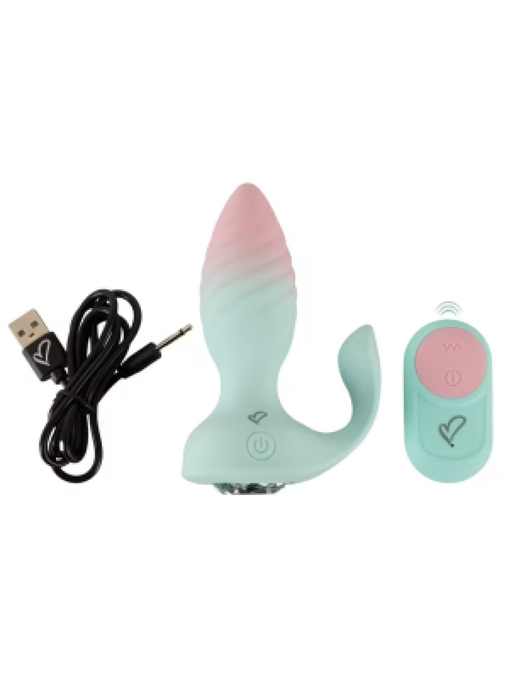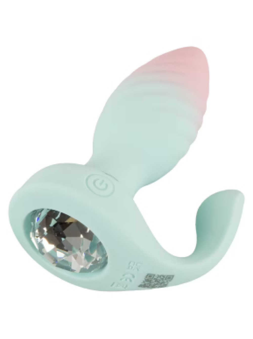 Анальная вибро-пробка с внешним стимулятором Эта анальная пробка одновременно ублажает изнутри и снаружи благодаря гибкому внешнему стимулятору. Ребристая внутренняя часть и стимулятор обеспечивают 10 режимов вибрации, управляемых пультом дистанционного управления (радиус до 10 м) или кнопкой на игрушке. Два тихих, мощных мотора дарят интенсивное, но почти бесшумное удовольствие. Коническая форма из шелковистого мягкого силикона легко вводится и удобно сидит, а гибкий стимулятор повторяет каждое движение и надежно прилегает к промежности. Пробка комфортно носится длительное время, подходит для сольных игр и пары. На заглушке — декоративный камень. Перезаряжаемая — USB-кабель для зарядки и батарейка для пульта входят в комплект. Общая длина 11,5 см, длина введения 8,5 см, диаметр от 2 до 3,5 см. Длина внешнего стимулятора 5,3 см. Вес 104 г. Материалы: силикон, полиуретан, ABS.