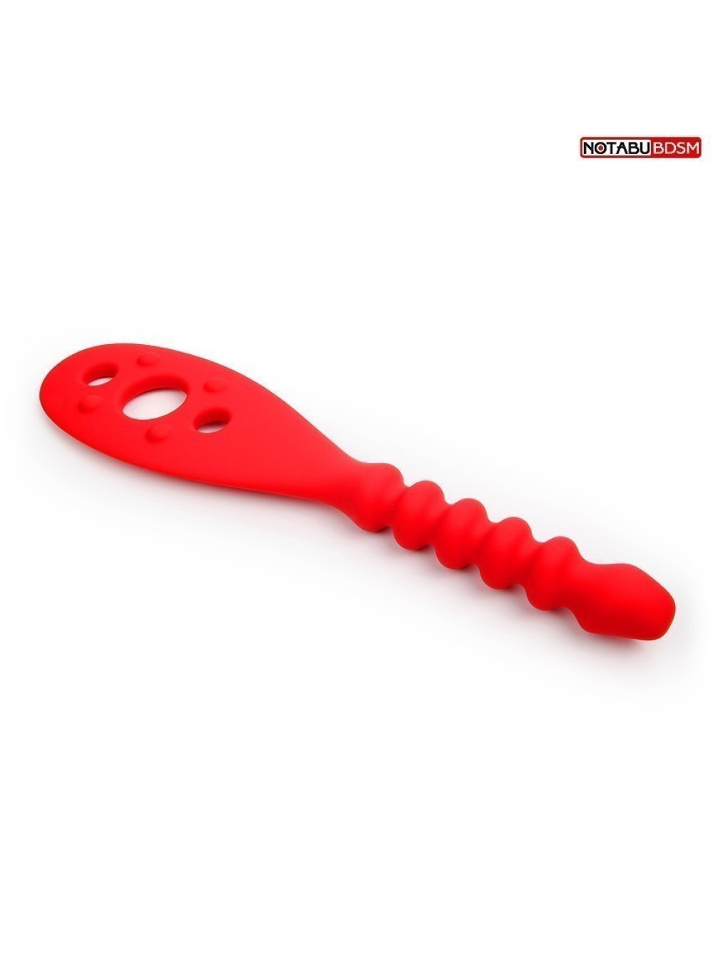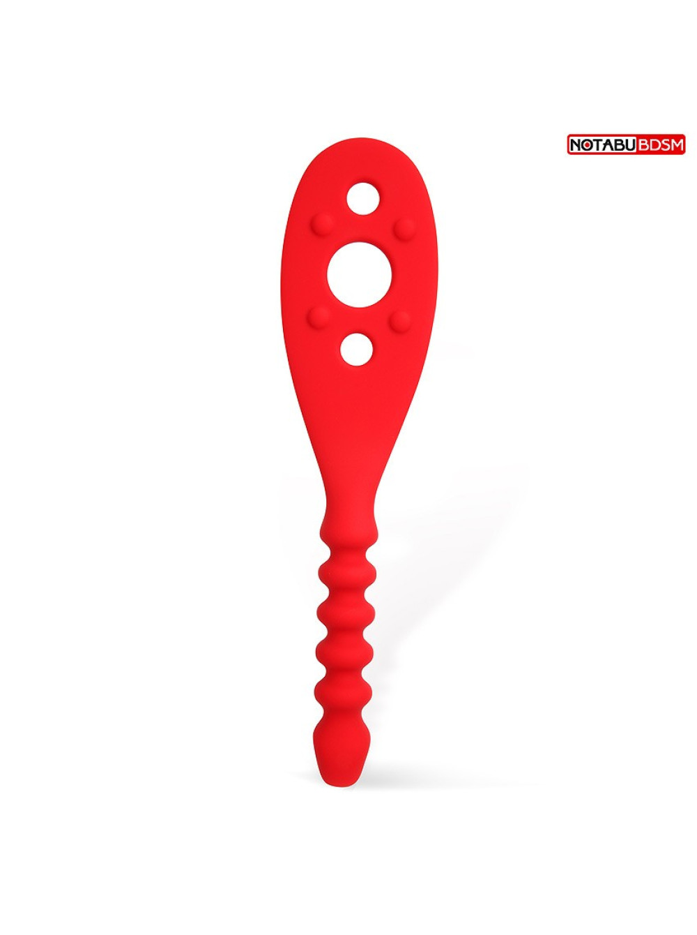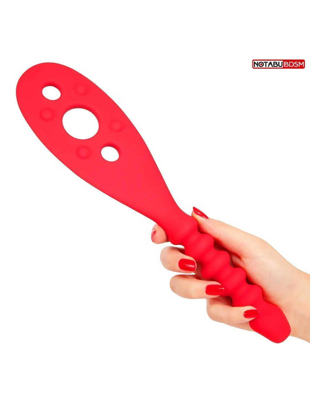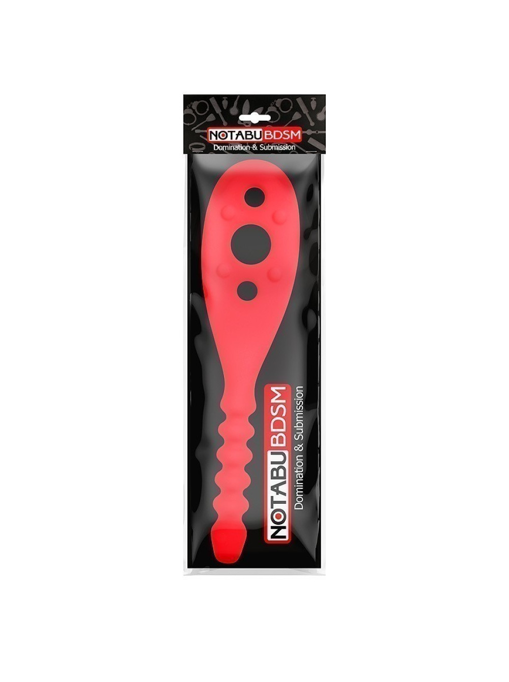 Двойной БДСМ аксессуар для любителей нестандартных эротических развлечений. Совмещает в себе шлёпалку и анальную втулку. Шлёпалка имеет широкую рабочую поверхность с жёсткими шипиками, усиливающими эффект от спанкинга. На шлёпалке имеются отверстия разного диаметра, которые могут отпечатываться на коже. Втулка имеет эргономичную форму ёлочки, способствующую более комфортному введению.