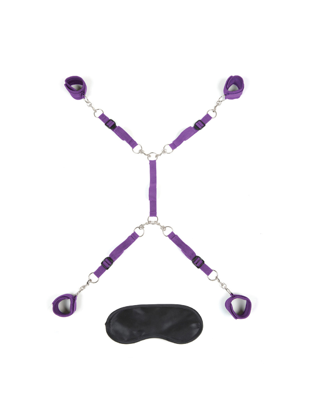 Простые крепления и мягкие манжеты обеспечат безопасный старт в мир бондажа. Комплект легко взять в любое путешествие, ведь для его использования не требуется никакого монтажа, нужна только ваша фантазия. Закрепите ремни на кровати, используя регулируемые петли. Зафиксируйте манжеты на запястьях и лодыжках партнера. Соедините ремни через центральное кольцо, создавая позицию «распятия» или «звезды». Добавьте маску для глаз (опционально) — пусть темнота усилит осязание и слух.