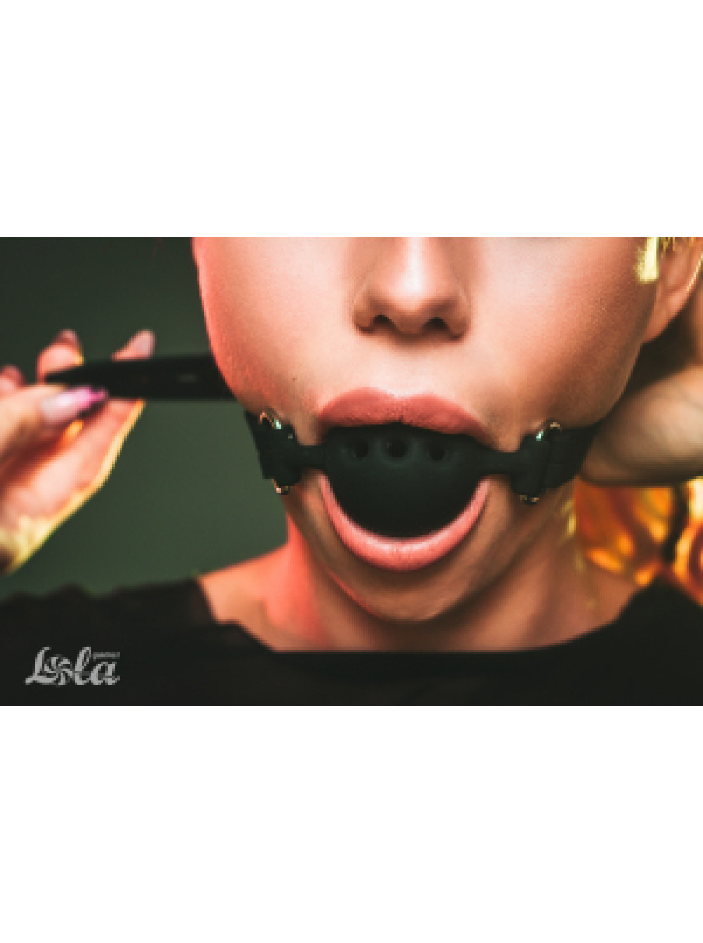 Силиконовый кляп-шар с ремешками из натуральной кожи черного цвета. Вдоль ремешков проходит лаковая кожаная накладка черного цвета. Регулируется девайс при помощи металлической пряжки. Металлическая фурнитура имеет никелевое покрытие.