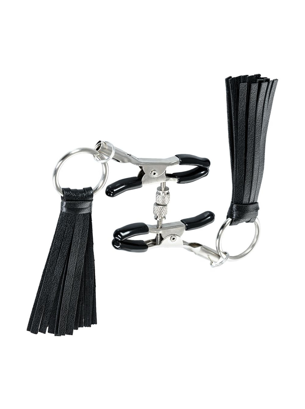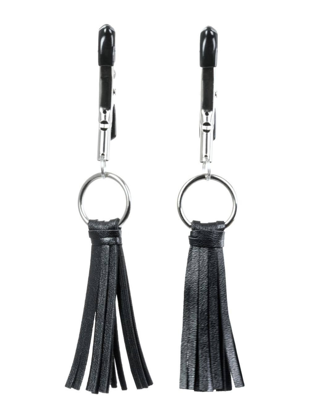 Зажимы классической формы украшены кисточками из PU- кожи. Они не только стимулируют соски, но и придают игривый вид. Сдавливание регулируется болтиком и может быть усилено или уменьшено во время интимной игры. Покрытие на концах зажимов защищает нежную кожу.