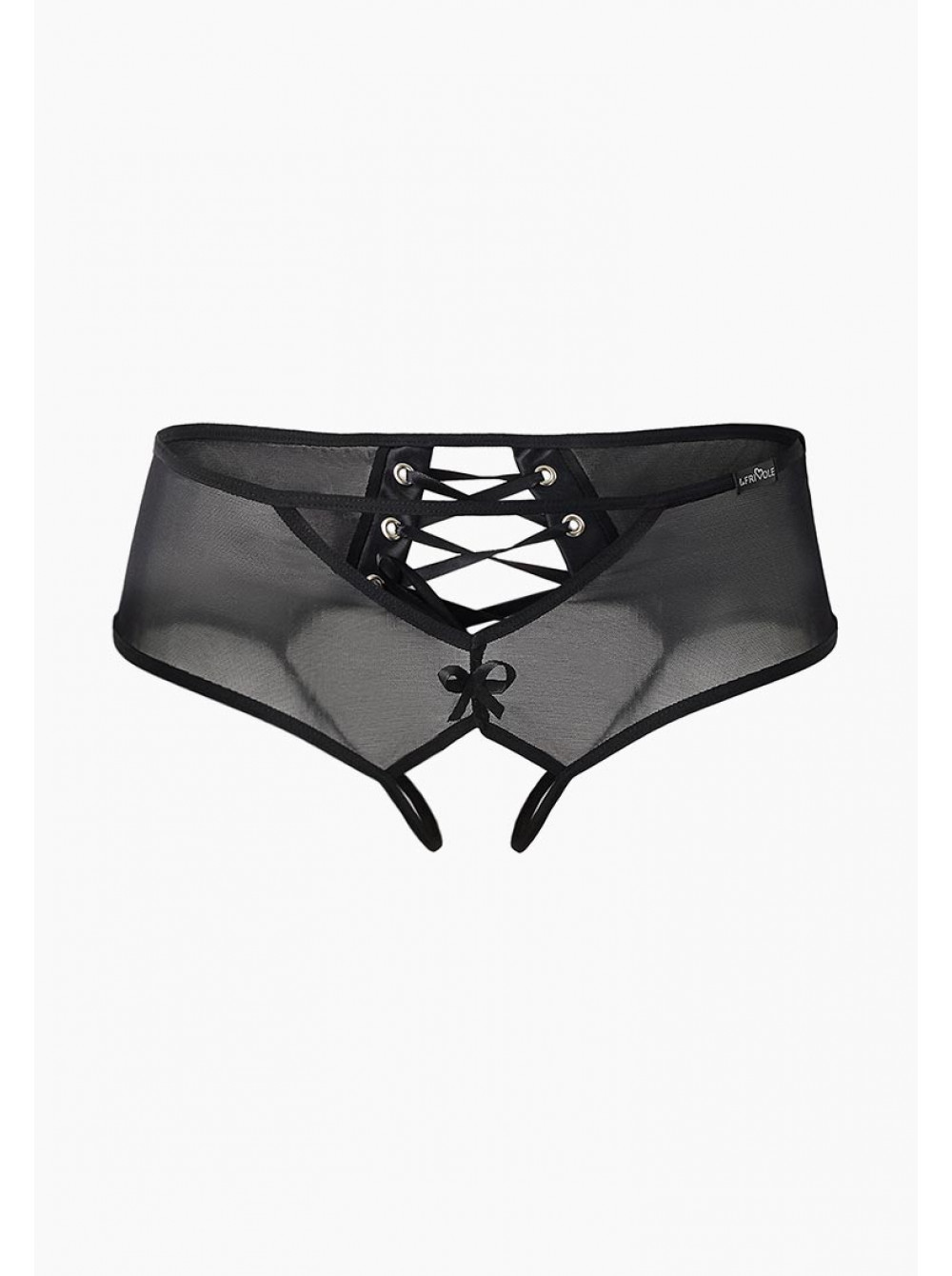 Передняя часть шортиков с доступом выполнена из полупрозрачной сетки, через которую просвечивает нежная кожа. Заднюю украшает провокационная «корсетная» шнуровка. Открой для себя новые грани экстремального наслаждения.
