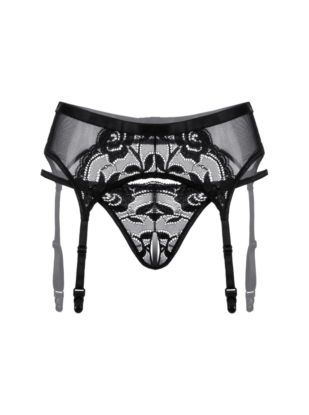 Пояс для чулок и стринги, выполненные из тонкой сетки, спереди украшенные кружевными вставками. Застежка пояса сзади. Т-стринги с вырезом в интимной зоне.