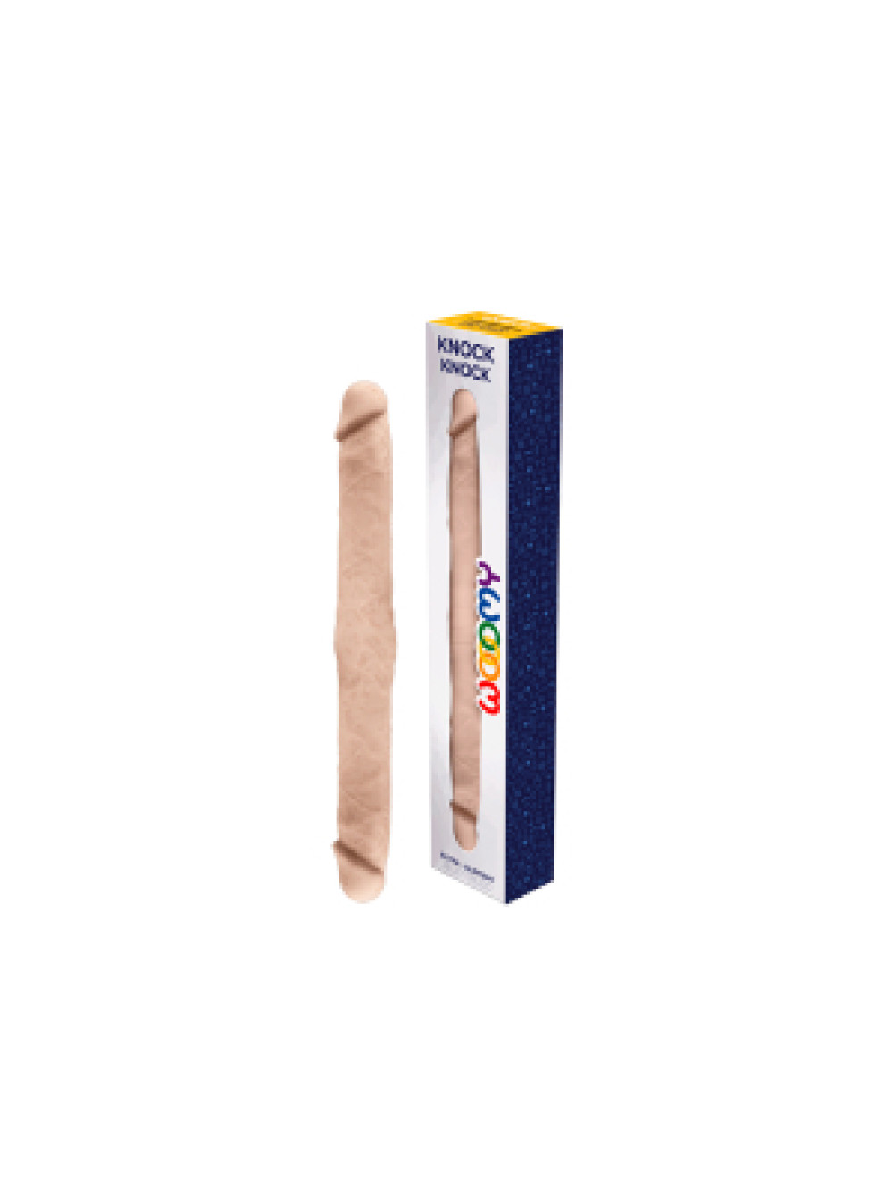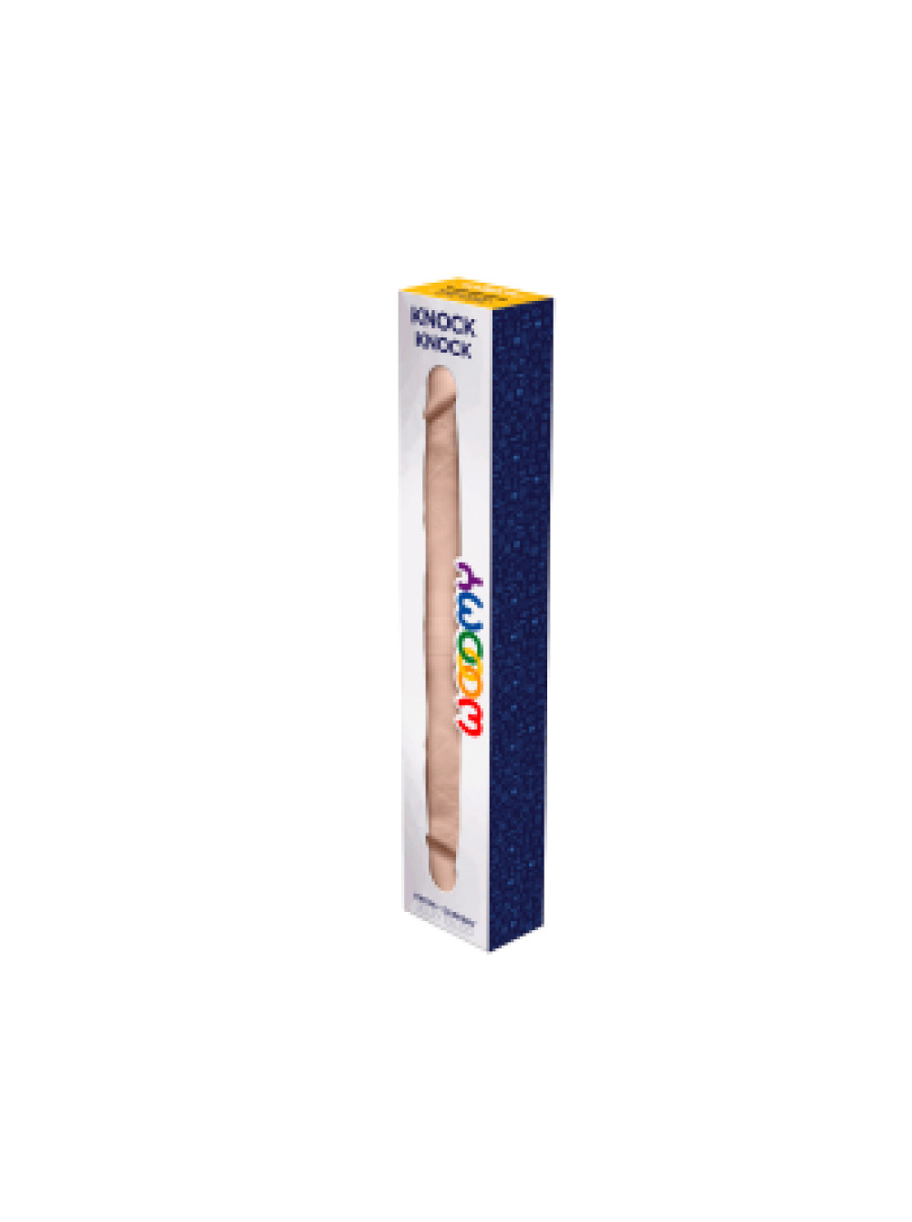 Knock-Knock — фаллоимитатор, изготовленный из гипоаллергенного ТПЕ, идеально подходит для одновременной двойной пенетрации. Две реалистичные головки с плавными изгибами обеспечивают глубокую и комфортную стимуляцию, подходящую для вагинального и анального применения. Длина достигает 38,5 см, диаметр — 3,9 см, вес — 446 г. Водонепроницаемость IPX8 позволяет наслаждаться им в любых условиях, а эргономичный дизайн упрощает уход.