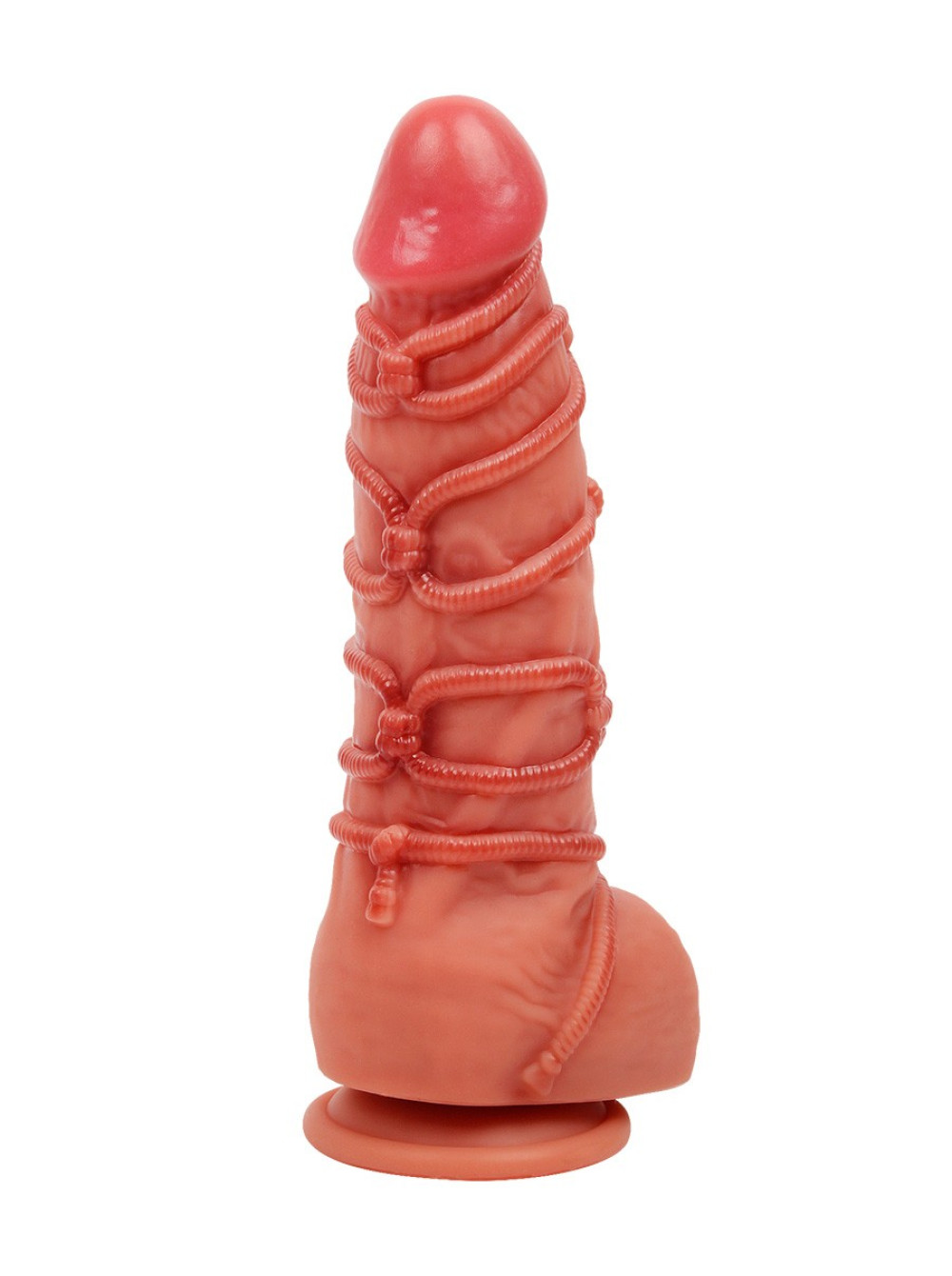 Ярко выраженные головка и мошонка, хорошо прорисованные складочки и венки, естественный оттенок поверхности придают изделию максимальной реалистичности. Объёмный ствол дарит чувство наполненности. Имитация верёвки, обмотанной вокруг пениса, усиливает возбуждение.