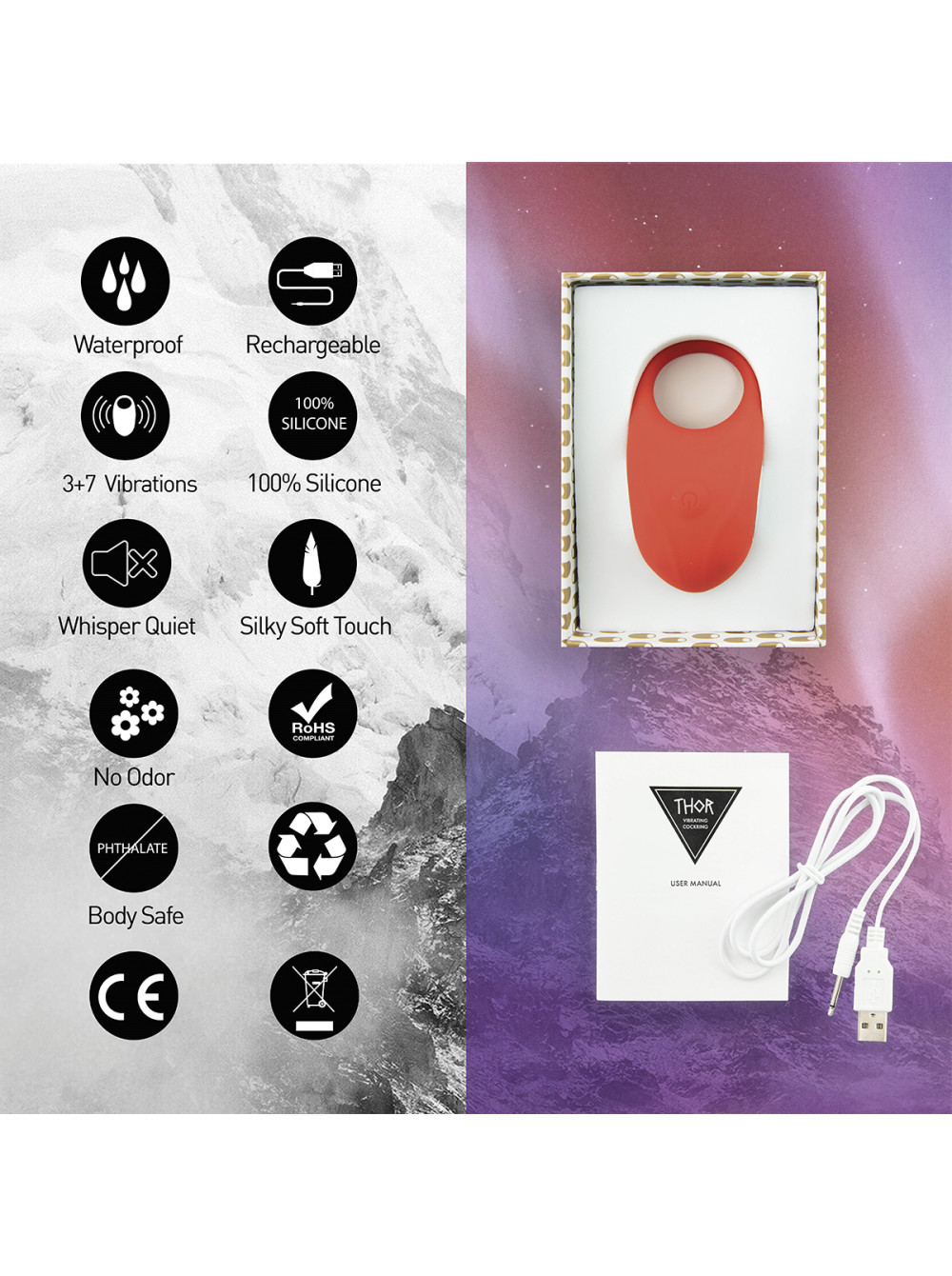 Водонепроницаемое вибрирующее кольцо для пениса красного цвета Thor от Feelztoys сделает мужскую эрекцию более продолжительной и сильной, за счет плотного обхвата полового член. Оно обладает сильными вибрациями и может использоваться как для одиночной игры, так и для пар. Для мужских соло-игр Вы можете носить эрекционное кольцо повернув его вибрирующим язычком вниз для стимуляции мошонки или во время парных игр - вверх, для стимуляции клитора женщины. Thor имеет 3 разные скорости и 7 разных паттернов вибрации, абсолютно не имеет запаха, с очень тихим мотором. Кольцо выполнено из шелковистого мягкого силикона и имеет идеальную форму, при полной зарядке оно проработает около двух часов. Размеры кольца 9 см на 4,5 см. Аккумулятор: 200 мАч (перезаряжаемый через USB).