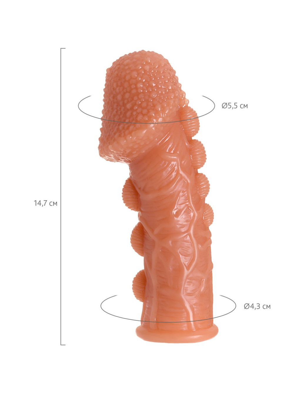 - Желанное разнообразие. Насадка придает члену внушительный объем и новую форму, поэтому как нельзя лучше подходит для сценариев «Секс с незнакомцем». При этом рельеф в виде увеличенной текстурированной головки, венок по всей поверхности и выпуклых бугорков, имитирующих пирсинг, привносит незабываемый эффект новизны в ощущения партнерши.
