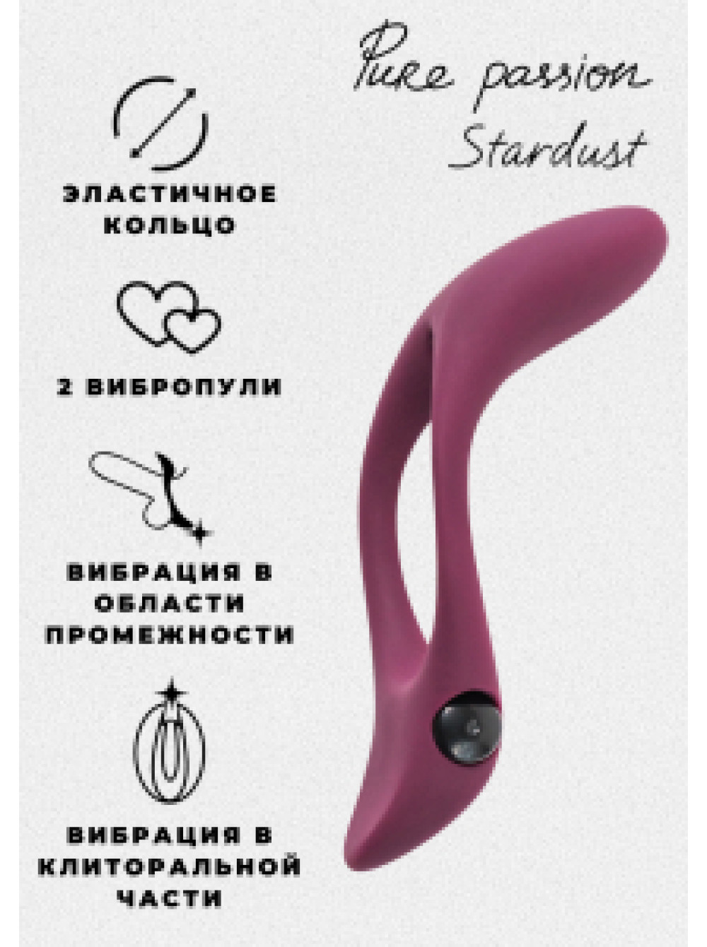 Эрекционное кольцо Stardust прекрасно подойдет для стимуляции промежности и клитора. Нижний отросток длиной 4,9 см со съемной вибропулей внутри позволит полностью покрыть промежность нежной и в то же время мощной вибрацией. А верхний загнутый отросток высотой 3,5 см вместе с вибропулей внутри будет дополнительно стимулировать клитор партнерши. Кольцо выполнено из бархатного и гипоаллергенного силикона. Кольцо хорошо тянется и подходит для всех размеров. Вибропули можно с легкостью извлечь из силиконового кольца и использовать отдельно. Питание вибропуль осуществляется с помощью 2-ух батареек LR41. Материал - силикон. Общая длина - 13 см. Внутр. высота кольца - 5,3 см. Внутр. ширина кольца - 3,5 см