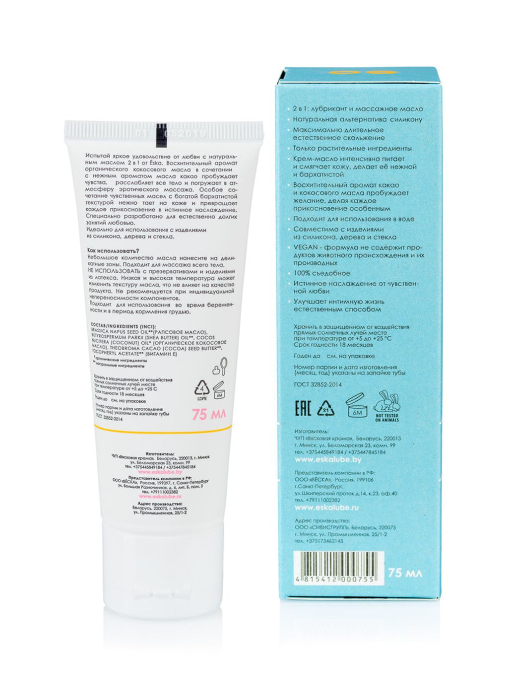 Испытай яркое удовольствие от любви с натуральным маслом 2 в 1 от Ёska. Восхитительный аромат органического кокосового масла в сочетании с нежным ароматом масла какао пробуждает чувства, расслабляет все тело и погружает в атмосферу эротического массажа. Особое сочетание чувственных масел с богатой бархатистой текстурой нежно тает на коже и превращает каждое прикосновение в истинное наслаждение. Специально разработано для естественно долгих занятий любовью. Идеально для использования с изделиями из силикона, дерева и стекла. Использование: Небольшое количество масла нанесите на деликатные зоны. Подходит для массажа всего тела. НЕ ИСПОЛЬЗОВАТЬ с презервативами и изделиями из латекса. Низкая и высокая температура может изменить текстуру масла, что не влияет на качество продукта. Не рекомендуется при индивидуальной непереносимости компонентов. Подходит для использования во время беременности и в период кормления грудью. Состав: рапсовое масло, масло ши, органическое кокосовое масло, масло какао, витамин Е.