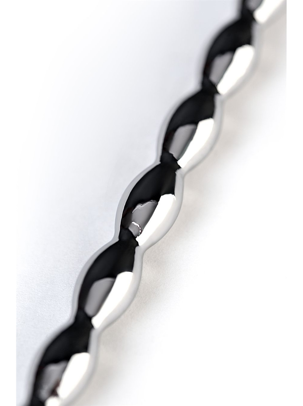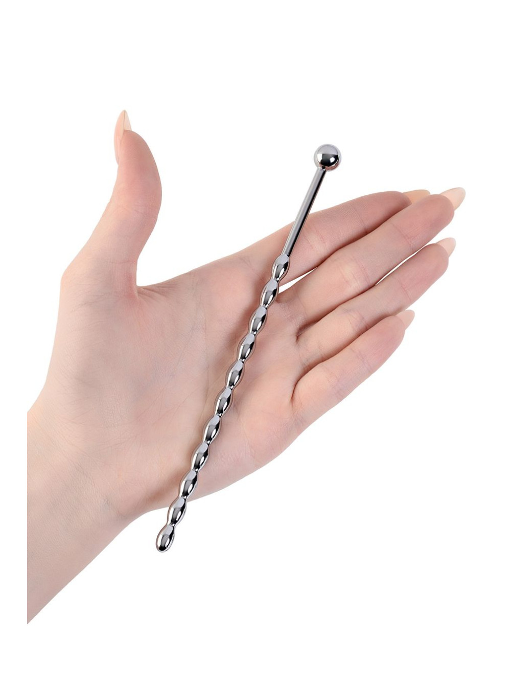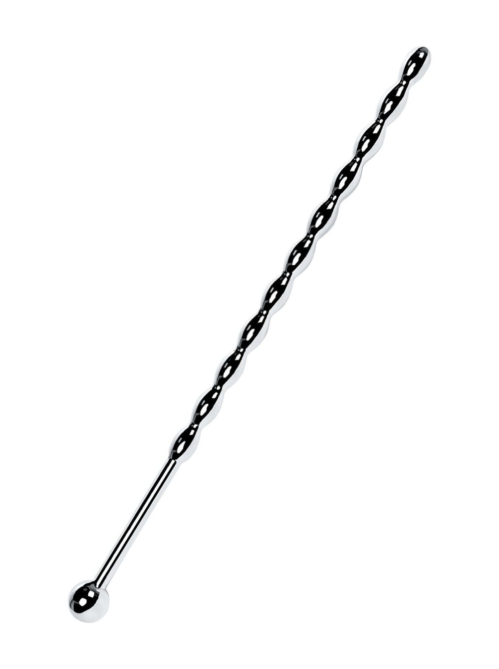 Уретральный плаг в форме косички. Небольшие звенья плавно меняют диаметр. Прекрасный вариант для исследования чувствительности своего организма: шарик на конце и удлиненное расстояние до фигурной части добавляют удобства при стимуляции уретры.