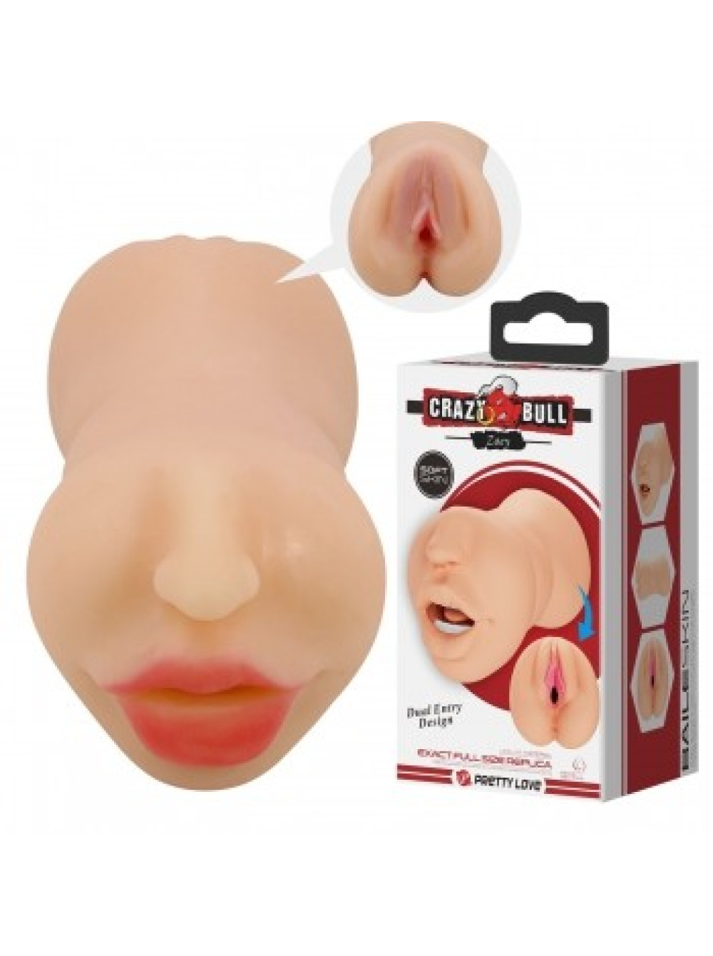 Двойной сквозной мастурбатор для мужского удовольствия. С одной стороны - это вагина с ярко выраженными половыми губами и внутренней рельефной поверхностью, с другой – сексуальный ротик с окрашенными губками, чувственным язычком и твёрдыми белыми зубками.