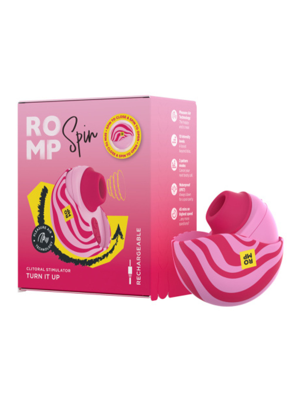 Romp Spin — компактный и стильный клиторальный стимулятор, сочетает в себе заботу о теле и передовые технологии. Благодаря функции Pleasure Air, стимулятор не касается клитора напрямую, а мягко воздействует на него волнами воздушных импульсов. Это значит — никакого раздражения, только чистое, нарастающее удовольствие.