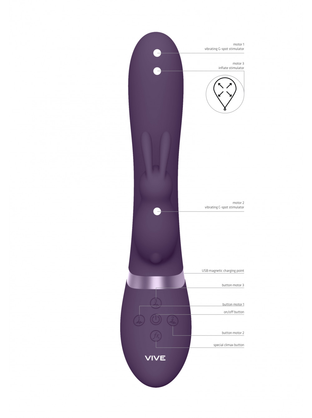 Изготовлено изделие из шелковистого медицинского (гипоаллергенного) силикона и как большинство моделей линейки VIVE имеет кнопку мгновенного оргазма, запуская все моторы на максимум одним касанием.