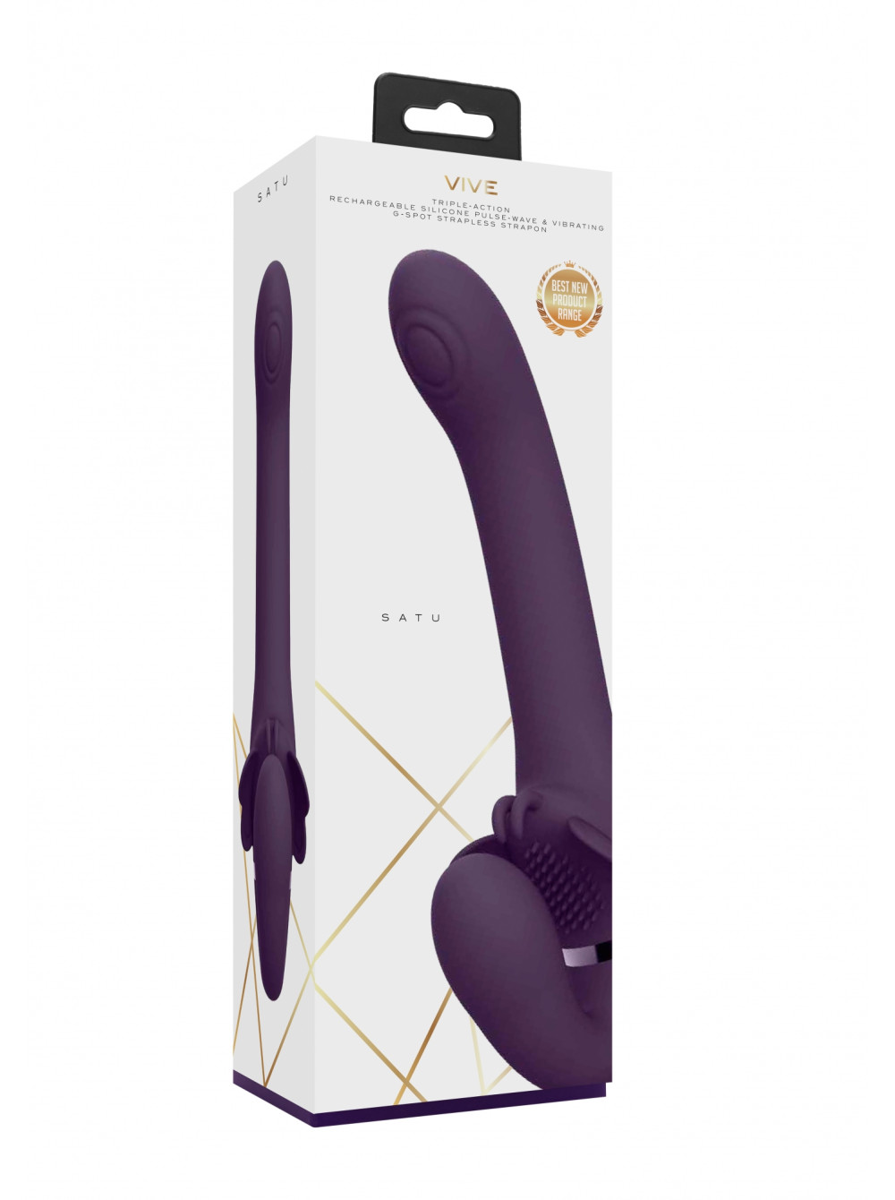 Satu – это безремневой страпон, который взял все самое лучшее от вибраторов линейки VIVE. Оснащен 3 мощными независимыми моторами: 2 импульсно-волновых в головке вибратора по одному для каждого партнера для активной стимуляции точки G/P, вибрационный мотор клиторальном отростке. При этом Satu достаточно тихий, не смотря на всю его мощь.