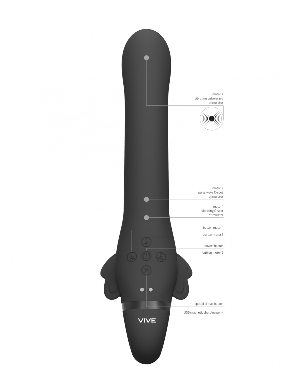 Изготовлено изделие из шелковистого медицинского (гипоаллергенного) силикона и как большинство моделей линейки VIVE имеет кнопку мгновенного оргазма, запуская все моторы на максимум одним касанием.