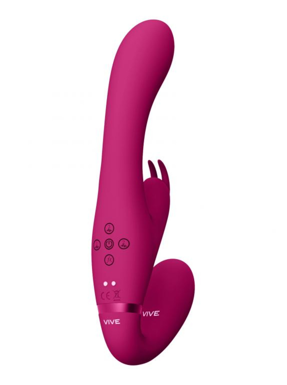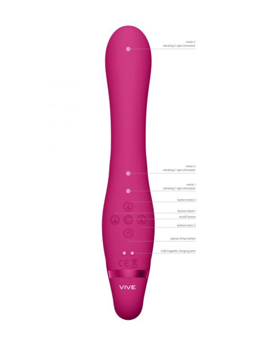 Изготовлено изделие из шелковистого медицинского (гипоаллергенного) силикона и как большинство моделей линейки VIVE имеет кнопку мгновенного оргазма, запуская все моторы на максимум одним касанием.